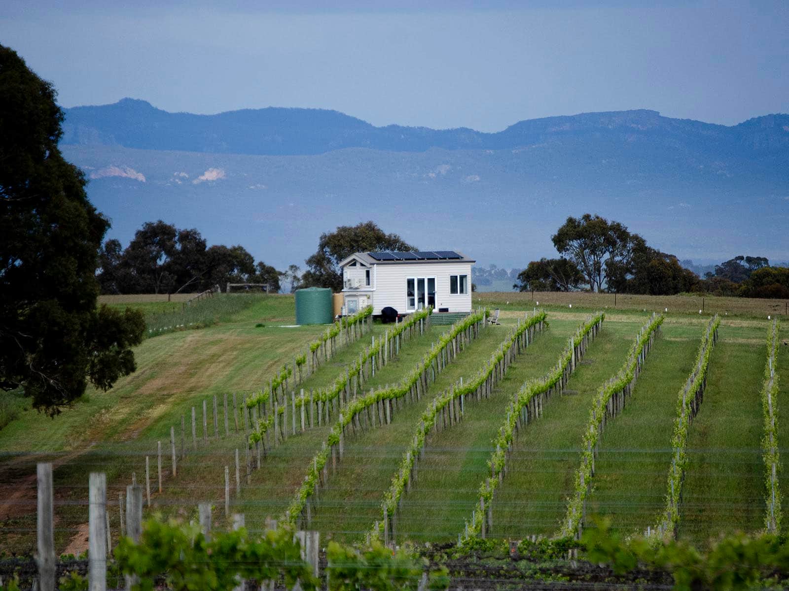 The house is located on the secluded far northwest corner of the property at the top of the vineyard, overlooking Shiraz vines with spectacular 360° views of the Eastern Grampians. This location was originally earmarked for a cellar door by the previous owners.